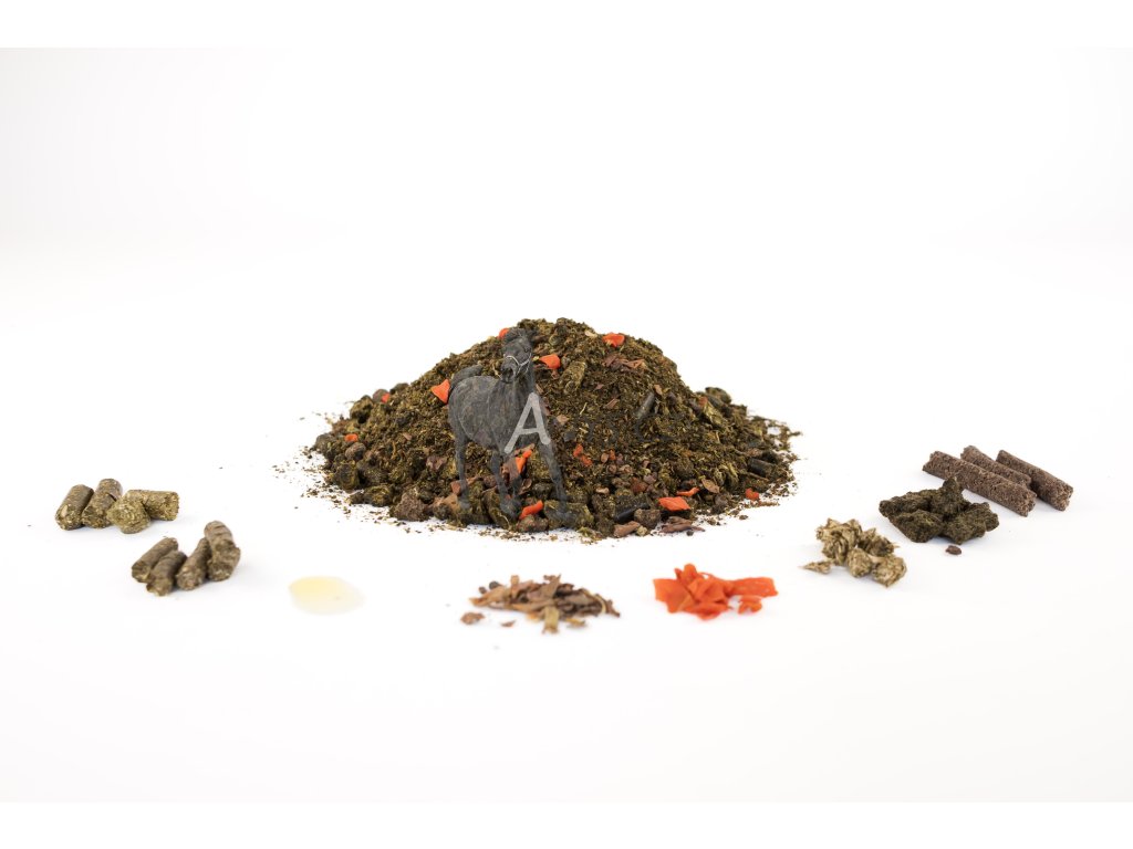 Vysoce kvalitní bílkovinné krmivo s čerstvými komponenty je vhodné pro všechny koně s omezením cukrů a škrobů, v každém balení 15 kg je 3/4 L čerstvého lněného oleje a taky bylinka čekanka která je velmi vhodná pro potíže s žaludkem a trávením celkově.