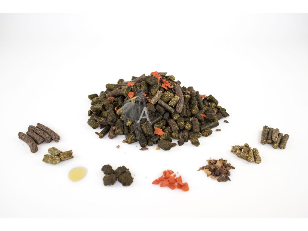 vojtěškové úsušky, konopné výlisky, lněné výlisky, granulované seno, jablečné výlisky, lněný olej, čekanka, mrkev sušená